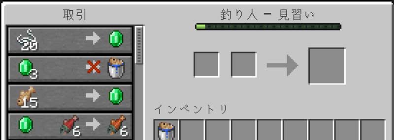 釣り人とは村人の職業のひとつです。釣り人は釣り系のアイテムとエメラルドを交換してくれる村人で、糸や魚をエメラルドで交換できます。