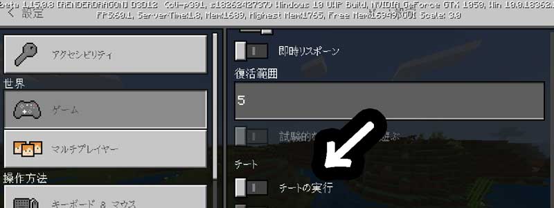 統合版の人は『設定 → チートの実行』をオンにしましょう。