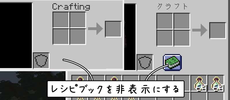追加される機能はとてもシンプル。レシピブックを消すだけです。レシピを覚えている人にとっては邪魔な存在なレシピブックを消してしまうことができます。